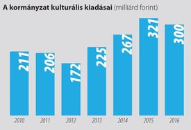 300 milliárd forintAz Orbán-kormány mindkét ciklusa alatt jelentős figyelmet és anyagi erőt fordított a kulturális területek fejlesztésére. A kulturális kiadások összege a 2010-es 211 milliárd forintról 2016-ra 300 milliárdra nőtt. Jelenleg prioritást élvez a nemzeti közgyűjtemények tevékenységének fejlesztése és a szervezeti-szakmai korszerűsítés.