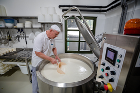 – Magyarországon nincs olyan laborháttér, amivel a helyi jellegű baktériumtörzseket detektálni, izolálni, majd szaporítani lehetne – hívja fel a figyelmet egy nehézségre Reményik Kálmán, miközben egy speciális eszközzel, a sajthárfával épp a következő adag Balaton sajt alapanyagául szolgáló alvadékot vágja-kevergeti megfelelő állagúra, gyorsítva a savó kiválását.