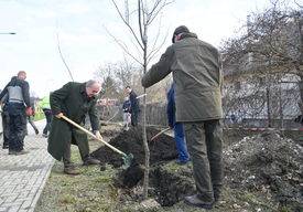 Zambó Péter, az Agrárminisztérium erdõkért és földügyekért felelõs államtitkára (b) segít a faültetésben a Településfásítási programról tartott sajtótájékoztató után Pátyon 2024. november 26-án.