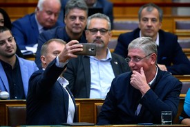 Varju László, a DK képviselője fotóz, mellette Gyurcsány Ferenc, a DK frakcióvezetője (j) az Országgyűlés rendkívüli plenáris ülésén 2019. szeptember 18-án.