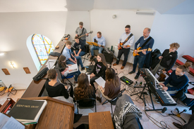 A 13 tagú templomi zenekart négy apa és 9 tinédzser alkotja, illetve mire megszámolnám őket, már 15-en vannak, mert kézen fogva beesnek a későn jövők.