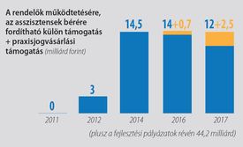 Az első lépések természetesen nem hozhattak áttörést, de jelezték: megvan az elszántság arra, hogy javítsák a helyzetet. Az adósságcsapdából kiszabadult ország 2012 óta évről évre többet tud költeni a háziorvosok helyzetének stabilizálására. Először 3 milliárd forint pluszpénz jutott a háziorvosoknak, házi gyermekorvosoknak és fogorvosoknak, ez azonban inkább csak tűzoltásra volt elegendő. 2014-ben először 4,5 milliárd, majd az év második felében további 10 milliárd forintot szánt e célra a kincstár. A 2016-os tízmilliárd forint kiegészült a fogorvosi rendelők fejlesztését szolgáló további 2 és a védőnői szolgálatokat megerősítő 2 milliárd forintos juttatással. Az idei, összesen 12 milliárd forintos támogatás immár megszilárdította azt a helyzetet, hogy az alapellátásban működő orvosok a kártyapénz mellett biztosan számíthatnak arra a havi 130 ezer forintra, amely fedezheti a rendelők fenntartását és az asszisztensek javadalmazását. Összességében az elmúlt hét évben 43,5 milliárd forintot költött az ország hazai forrásból az alapellátó rendszer stabilizálására. Ez lehetőséget teremtett arra is, hogy további 44,2 milliárd forint uniós támogatást is praxisuk fejlesztésére költhessenek az orvosok.