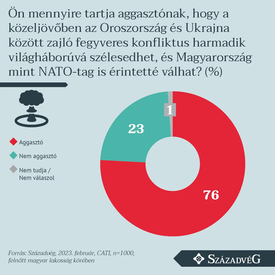 A kutatási adatok tanúsága szerint a magyarok több mint háromnegyede (76 százaléka) aggódik amiatt, hogy a közeljövőben az orosz–ukrán fegyveres konfliktus harmadik világháborúvá szélesedhet, és hazánk – a NATO tagjaként – érintetté válhat – írja a Századvég.