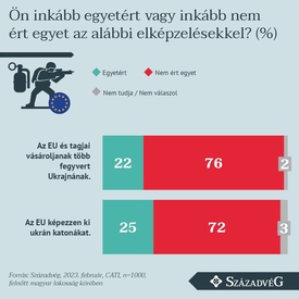 a megkérdezettek 76 százaléka nem ért egyet azzal, hogy az Európai Unió és tagjai több fegyvert vásároljanak Ukrajnának, továbbá 72 százalékuk ellenzi, hogy az Európai Unió képezzen ki ukrán katonákat.