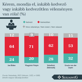 Vlagyimir Putyin orosz elnökről a válaszadók 71 százaléka, Joe Biden amerikai elnökről 64 százalékuk fogalmazott meg kedvezőtlen véleményt. Volodimir Zelenszkijről a magyarok 62 százaléka, Ursula von der Leyenről a megkérdezettek több mint fele (53 százaléka) nyilatkozott negatívan.