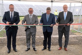 Biczók András, a Magyar Villamosenergia-ipari Átviteli Rendszerirányító (Mavir) Zrt. elnök-vezérigazgatója, Lantos Csaba energiaügyi miniszter, Tállai András, a térség fideszes országgyűlési képviselője és Ritter Antal, a beruházó PolSolar Kft. ügyvezetője (b-j) az ország legnagyobb egybefüggő napelemparkjának átadásán Mezőcsát határában 2023. június 6-án
