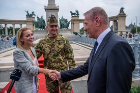 Benkő Tibor honvédelmi miniszter gratulál Farkas Norbert őrmesternek és kedvesének, Katona Petrának eljegyzésük alkalmából az MH Altiszti Akadémián idén végzett honvéd altisztek ünnepélyes avatásán Budapesten, a Hősök terén 2021. július 17-én