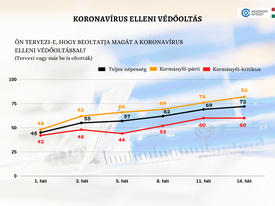 A felmérés szerint a kormánnyal szimpatizálók január óta nagyobb arányban oltáspártiak, mint a kormány tevékenységét kritikusan szemlélők. Az év elején ez a különbség még csak néhány százalékpontos volt: a baloldali érzelmű polgárok körében három százalékponttal kevesebben kívánták beoltatni magukat, mint a felnőtt-társadalom egészében. Február elejére a különbség 13 százalékpontra emelkedett (57 és 44 százalék), húsvét után pedig továbbra is 12 százalékpontos: ennyivel kisebb a kormánykritikusok oltási hajlandósága (összesen 60 százalék) a felnőtt-társadalomhoz (összesen 72 százalék) képest. A kormánypárti választópolgároknak jelenleg tíz százalékponttal nagyobb aránya oltáspárti (összesen 82 százalék).
