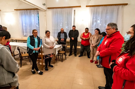 Beszélgetésünket egy hölgy szakítja meg: segítsünk kipakolni a most érkezett adományokat! Főleg ruhák jöttek, meg papír- és íróeszközök a gyerekeknek. Az asszonyok azonnal nekilátnak a válogatásnak. Közben örömmel fogadják, hogy aki szeretné, annak tudnak hozni kézimunkaeszközöket hímzéshez, horgoláshoz.