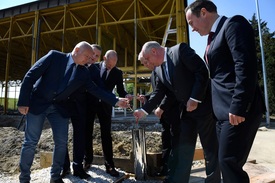 Tarlós István főpolgármester és Ughy Attila XVIII. kerületi polgármester szerda délelőtt ünnepélyes keretek között lerakta a Budapest Airport Aréna néven megújuló lőrinci sportcsarnok alapkövét.