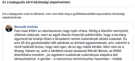 Bencsik András véleményét gyűlöletbeszédnek minősítette és törölte a Facebook.