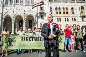 A civil szerveződés képviselője szerdán a Parlament előtt tartott sajtótájékoztatót. Előzőleg határozatképtelenség miatt berekesztették az Országgyűlés rendkívüli ülését, amelyen a városligeti beruházást lehetővé tevő Liget-törvény megsemmisítéséről szóló javaslat került volna napirendre.