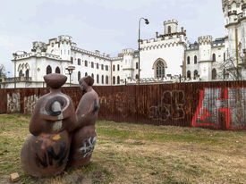 Innen is be lehet térni a kastélyparkba, végtelenül gondozatlan, bár a füvet olykor lekaszálják. A hatalmas fák mögött a szürke időben is felfehérlik a magyar Windsornak nevezett Lónyai-kastély, rozsdás, ronda kerítés veszi körbe. Szlovák nyelvű tábla figyelmeztet, hogy tilos bemenni. Noha Stefánia hercegnő, Habsburg Rudolf trónörökös exneje és II. Lipót, Kongó kegyetlen gyarmatosítójának lánya második házassága révén került Oroszvárra, beleszeretett Magyarországba, és végrendeletében a pannonhalmi bencés apátságra hagyta az épületet. A kastély kívülről nincs rossz állapotban, őrzi még az antik oszlop tetején álló oroszlán, ám 1947-ben államosították. 1951-től a Sľuk nevű szlovák néptánccsoport székhelyeként működött, ám a rendszerváltás óta üresen áll – eredeti berendezéséből semmi sem maradt. Az 1872-ben befejezett romantikus, Windsor-stílusú kastélyra a rendszerváltás után kárpótlás iránti kérelmet nyújtott be a Pannonhalmi apátság, ám a szlovákiai bíróság 1994-ben elutasította. Az apátság a strasbourgi Emberi Jogok Európai Bíróságánál és az Európai Unió Bíróságánál sem tudta érvényesíteni Stefánia végakaratát. Noha azóta nincsenek új fejlemények, jogi felülvizsgálat zajlik, amelynek célja a jogigény sikeres érvényesítése.