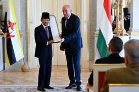 Sulyok Tamás köztársasági elnök átadja a Magyar Érdemrend nagykeresztje a nyaklánccal és az arany sugaras csillaggal kitüntetést Hassanal Bolkiah brunei szultánnak a Sándor-palotában 2025. november 18-án