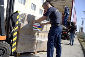 Adományokat pakolnak az Országos Kórházi Főigazgatóság pestszentlőrinci telepén 2022. március 21-én