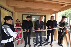 Az óvoda bejáratánál a magyar állam és a római katolikus egyház képviselője és a község elöljárója közösen vágták el a magyar és román nemzeti színű szalagot.