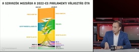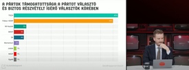 Róna Dániel: – Itt a 100 százalék az az, aki biztosra mondta a választási részvételét. […] Ez 640 ember volt az 1000-ből, tehát eleve csak 64 százalék biztos a részvételben, az a 36 százalék, aki nem biztos, csak valószínű, vagy valószínűleg nem, az nincs is benne ebben az ábrában. Egyébként a Fidesz az ő körükben népszerűbb, és ha benne lennének, akkor a narancssárga csík az egy picit hosszabb lenne, mint a türkiz Tisza-csík. Szóval ez az egyik, a másik, hogy éppen azért, mert itt csak 640 emberről van szó, a hibahatár az nem 3, hanem már 4 százalék, ami azt jelenti, hogy az a 42, amit a Tiszának mértünk, az 38 és 46 között van. És hogy a 38 és 46 között pontosan hol van? […] Azt egy mérés alapján nem lehet megmondani. És a Fidesznek a 40 százaléka az meg 36 és 44 között van.