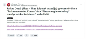 Farkas Dezső nemrég még „Pénz energia workshopot” és Farkas-szemlélet kurzusokat tartott.A Redditen olyan bejegyzésre bukkant a Mandiner, amely szerint Farkas Dezső, a Tisza Párt éppen a napokban első vonalba emelt vezetője törölte az általa korábban meghirdetett „Farkas-szemlélet kurzus” és a „Pénz energia workshop” menüpontokat is tartalmazó weboldalát.