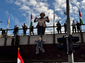 A Nyugati téri felüljáróról lelógva egy karton Magyar Péterrel bábozó Ursula von der Leyen köszönti a Békemenet résztvevőit: