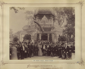 A Hubert-féle pezsgőgyár tagjai a millenniumi kiállításon a pavilonjuk előtt (1896)
