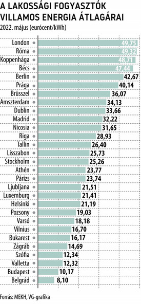 Stabilitást csupán két főváros mutat Európa-szerte: Budapest és Belgrád. Ahogy 2021-ben, úgy 2022-ben is a magyar és a szerb fővárosban a legolcsóbb az áram a lakosság számára, ráadásul mindkettő esetében csökkenés figyelhető meg éves bázison. A rezsicsökkentés eredményeként országosan, így Budapesten is fixált ár 2022 májusában egészen pontosan 10,17 eurocent volt. Egy évvel korábban 10,40. Belgrádban ugyanebben az időszakban 8,11-ről 8,10-re változott.