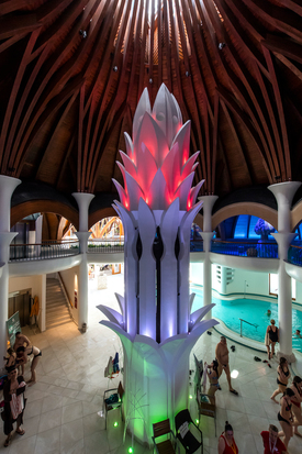 Makovecz Imre elképzelései alapján a fürdőkomplexum új épületében is az egykori Pannon-tenger ezerméteres mélységéből feltörő megkövesedett vízcseppjei jelennek meg a kupolák halmazában. A galériaszinten Atlantisz világa, az aranykor – egy valaha volt vagy lehetett volna civilizáció – kel életre. Vanyúr István 28 alkotásból álló szimbolikus szoborparkja mitikus vízi világba kalauzol bennünket. Az élményt Horgas Péter látványtervező különleges fényjátéka teszi teljessé.