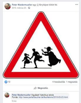A DK-s polgármester általánosítva, kvázi az összes katolikus iskolát vádolta pedofíliával, amikor egy olyan útjelző táblát posztolt, amelyen kisgyermekek menekülnek egy pap elől. Niedermüller azt írta a képhez hozzászólásként: „Vigyázat! Katolikus iskola”.