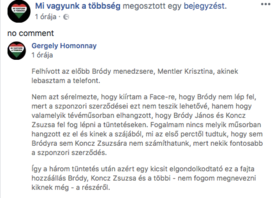 „Felhívott az előbb Bródy menedzsere, Mentler Krisztina, akinek lebasztam a telefont. Nem azt sérelmezte, hogy kiírtam a Face-re, hogy Bródy nem lép fel, mert a szponzori szerződései ezt nem teszik lehetővé, hanem hogy valamelyik tévéműsorban elhangzott, hogy Bródy János és Koncz Zsuzsa fel fog lépni a tüntetéseken. Fogalmam nincs melyik műsorban hangzott ez el és kinek a szájából, mi az első perctől tudtuk, hogy sem Bródyra sem Koncz Zsuzsára nem számíthatunk, mert nekik fontosabb a szponzori szerződés” – írta sértődötten Homonnay. „Így a három tüntetés után azért egy kicsit elgondolkodtató ez a fajta hozzáállás Bródy, Koncz Zsuzsa és a többi – nem fogom megnevezni kiknek még – a részéről.”