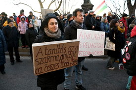 Résztvevõk a tanárok béremeléséért tartott tüntetésen a Belügyminisztérium elõtt 2024. január 13-án. A demonstrációt az Egységes Diákfront, a Pedagógusok Demokratikus Szakszervezete (PDSZ), a Fridays For Future Magyarország, a Hang, az ADOM Diákmozgalom, az Országos Közös Akarat és a Civil Bázis szervezte.