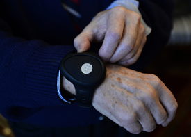 Egy 81 éves nyugdíjas férfi mutatja a csuklóján a Gondosóra programban kapott jelzõkészüléket a XI. kerületben, Budapesten 2022. március 17-én.