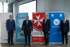 Kardos István, a Magyar Vöröskereszt főigazgatója, Bacsa György, a MOL Magyarország ügyvezető igazgatója, Szabadhegy Péter, a Magyar Máltai Szeretetszolgálat elnöke és Gáncs Kristóf, a Magyar Ökumenikus Segélyszervezet ügyvezető igazgatója (b-j) a MOHU MOL Hulladékgazdálkodási Zrt. sajtótájékoztatóján Budapesten, a MOL Campusban 2025. november 12-én