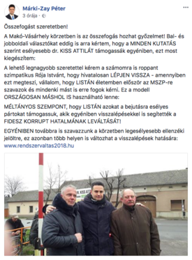 Márki-Zaynak az utolsó órákban tette közzé az ajánlatát, egész pontosan szombaton, 7:39-kor. Mint ismeretes, szombaton 11 óráig léphetnek vissza egymás javára a képviselőjelöltek. A Magyar Szocialista Párt nem reagált az ajánlatra, Márki-Zaj Péter pedig hoppon maradt. A Jobbik és az MSZP jelöltje egyaránt versenybe száll vasárnap Lázár János legyőzésére.