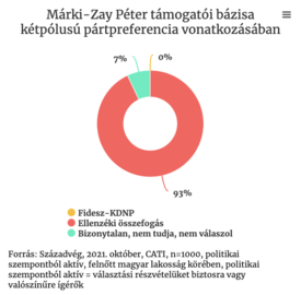 Az elemzés alapján hasonló a kép, ha a kétpólusú pártpreferenciák mentén vizsgálják Márki-Zay Péter szimpatizánsi táborának összetételét. A felmérés rávilágít arra, hogy a Márki-Zay Péter miniszterelnökségét favorizálók 93 százaléka az ellenzéki összefogást támogatná egy most vasárnap tartandó országgyűlési választáson, míg 7 százalékuk megtagadta a válaszadást vagy nem döntött a kérdésben. Márki-Zay támogatói körében a Fidesz-KDNP szimpatizánsainak jelenléte nem kimutatható – olvasható a Századvég közleményében.