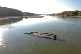 A második világháborúban elsüllyedt hajó roncsa a Duna árterében a folyó alacsony vízállásakor Vámosszabadi határában 2022. augusztus 17-én