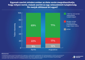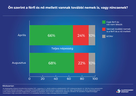 Az országosan reprezentatív kutatás szerint mindemellett a felnőtt lakosság több mint kétharmada (68 százalék) szerint csak két nem, női és férfi létezik (ez áprilisban még „csak” 66 százalék volt). A válaszadóknak most 22 százaléka vélekedett úgy, hogy kettőnél több nem van: tavasszal még az emberek közel negyede állította ezt – vagyis csökkent azok aránya, akik megkérdőjelezik a férfi és női nem hagyományos mivoltát.