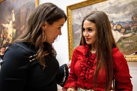 Novák Katalin családokért felelõs tárca nélküli miniszter és Tóth Ramóna, az ország első cigány nemzetiségi diákkörének elnöke beszélget a diákkör megalakulása után Kiskunhalason, a Thorma János Múzeumban 2021. november 5-én