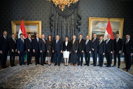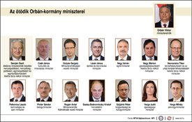 Budapest, 2022. május 24. A Miniszterelnöki Sajtóiroda által közreadott képen Orbán Viktor (b8) ötödik kormányának tagjai, miután átvették kinevezési okmányukat Novák Katalin köztársasági elnöktõl (k) Kövér László, az Országgyûlés elnöke (j8) jelenlétében a Sándor-palotában 2022. május 24-én. Balról jobbra Szalay-Bobrovniczky Kristóf honvédelmi miniszter, Rogán Antal, a Miniszterelnöki Kabinetirodát vezetõ miniszter, Palkovics László technológiai és ipari miniszter, Nagy Márton gazdaságfejlesztési miniszter, Lázár János építési és beruházási miniszter, Csák János kulturális és innovációs miniszter, Varga Judit igazságügyi miniszter, Gulyás Gergely, a Miniszterelnökséget vezetõ miniszter, Nagy István agrárminiszter, Navracsics Tibor területfejlesztésért és az uniós források felhasználásáért felelõs miniszter, Pintér Sándor belügyminiszter, Semjén Zsolt általános miniszterelnök-helyettes, a nemzetpolitikáért, nemzetiségpolitikáért, egyházpolitikáért és egyházdiplomáciáért felelõs miniszter, Szijjártó Péter külgazdasági és külügyminiszter és Varga Mihály pénzügyminiszter.