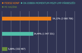 A pártlistákra leadott összes szavazatszám 8 587 628 volt. A Fidesz-KDNP-nek összesen – a töredékszavazatokkal együtt – 4 390 962 szavazata volt, a DK-Jobbik-Momentum-MSZP-LMP-Párbeszéd listának 3 526 480, a Mi Hazánk Mozgalomnak 639 551.