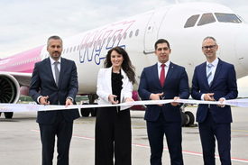 Gabriel Sopanda, Románia magyarországi nagykövete, Yvonne Moynihan, a Wizz Air légitársaság vállalati és ESG vezérigazgatója, Antal Ferenc, a Nemzetgazdasági Minisztérium stratégiai tranzakciókért felelős helyettes államtitkára, a Budapest Airport Zrt. igazgatóságának tagja és Bogáts Balázs, a Budapest Airport kereskedelmi vezérigazgató-helyettese (b-j) átvágja a szalagot a Brassóból érkezett első menetrend szerinti légi járat fogadása után a Liszt Ferenc-repülőtéren tartott sajtótájékoztatón 2024. július 2-án