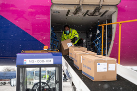 Kipakolják a Wizz Air Sanghajból érkezett repülőgépének szállítmányát a Liszt Ferenc-repülőtéren 2020. március 23-án. A gép a koronavírus elleni védekezéshez használható védőruhából harmincezret, orvosi védőmaszkból nyolcvankétezret hozott.