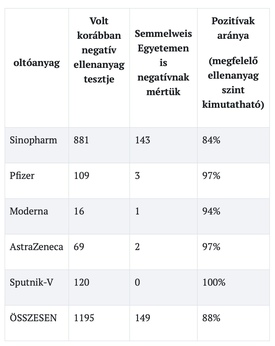 Fontos hangsúlyozni, ezeket a méréseket korábban negatív ellenanyagszinttel rendelkező szelektált populációnál végezte el az intézmény, akiknél mintegy 88%-ban igazolható volt az ellenanyag-pozitivitás. A teljes oltott lakosság esetében egy ezt megelőző vizsgálat minden Magyarországon alkalmazott vakcina esetében 96% feletti pozitivitást mutatott.