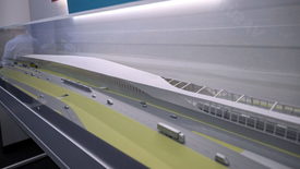 Az új Nádorliget vasúti megálló makettje a Déli körvasút fejlesztését bemutató látogatóközpontban Budapesten a megnyitó napján, 2025. szeptember 24-én