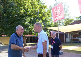 Szabadhegy Péter, a Magyar Máltai Szeretetszolgálat elnöke (b2) fogadja Sulyok Tamás köztársasági elnököt (b) a szeretetszolgálat balatonfenyvesi ifjúsági mozgássérülttáborában 2025. augusztus 25-én