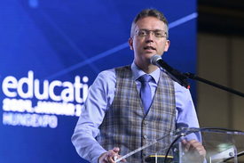 Hankó Balázs előadást tart a megújult felsőoktatási felvételi rendszerről az Educatio Nemzetközi Oktatási Szakkiállításon a budapesti Hungexpón 2024. január 9-én