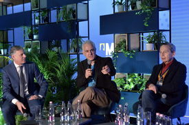 Boris Kalnoky, moderátor, az MCC Médiaiskola vezetője, Peter Boghossian, filozófus, oktató, író, az MCC vendégoktatója és Frank Füredi, szociológus, a Kenti Egyetem emeritus egyetemi tanára (b-j) az MCC Budapest Summit elnevezésű kétnapos konferencián 2022. február 16-án