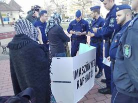 Elmondása szerint alighogy elkezdődött az esemény, két ember jelent meg fejkendőben, csadorra hasonlító öltözékben. Fölállítottak egy kisebb paravánt, amelyre az „Imaszőnyeg kapható” szöveget írták. Magukkal hoztak egy magnót, amelyet be akartak kapcsolni, de ezt a rendőrség nem engedte. Szinte azonnal közbeléptek a rendőrök, igazoltatták, majd elvezették őket – tette hozzá.