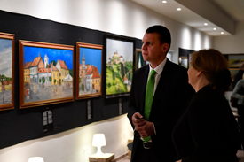 Menczer Tamás államtitkár Polgár Marianne Bánffy Miklós-díjas grafikus Magyar táj magyar ecsettel című kiállításának megnyitóján Budaörsön, a Zichy-kastélyban 2021. október 18-án