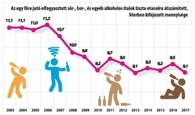 A járvány világszerte megváltoztatta a kereskedelmi és fogyasztási szokásokat, ami alól az alkohol sem kivétel. Egy nemzetközi tanulmány szerint az első hullám tavaszán világszerte 291 százalékkal nőtt az alkoholeladás. Ez alól hazánk sem kivétel: a NAV mérése szerint tavaly februárban, amikor a járványhelyzet miatt szinte mindenki pánikszerű vásárlásba kezdett, a korábbi évhez képest 80, márciusban pedig 50 százalékkal ugrott meg az alkoholforgalom. A következő nagyobb emelkedés a karantén végére, június-júliusra esett, amikor tíz-harminc százalékkal nőtt a fogyasztás. Kutatók szerint a koronavírus alatt – többek között a vendéglátóhelyek bezárása miatt – kevesebben fogyasztottak alkoholt, ám akik addig is rendszeresen ittak, azok most még többet. A Központi Statisztikai Hivatal nyáron készített, 2003-tól gyűjtött adatokat tartalmazó grafikonja azonban rámutat egy másik jelenségre, miszerint a 2000-es évek óta meredeken csökken a hazai egy főre jutó, tiszta etanol­ra átszámított, literben mért fogyasztás.