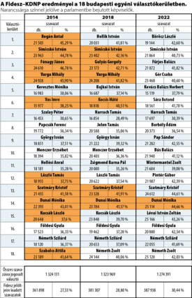 A táblázat számait nézve első pillantásra nyilvánvaló, hogy a kormánypártok idén egészében véve hozták ugyanazt a támogatottságot, amellyel a lehetséges 18-ból 2014-ben tíz, 2018-ban hat, 2022-ben egy mandátumot nyertek el. Összességében valójában még javítottak is. Ha a számításunkból kiszűrjük a lakosság létszámában bekövetkező változás, valamint a mozgósítások hatását, és a támogatás mértékét az adott évben meglévő összes választásra jogosultra vetítjük, kiderül, hogy a kormánypártok választásról választásra növelték támogatottságukat: 2014-ben budapesti egyéni képviselőjelöltjeik együttesen a névjegyzékben szereplők szavazatainak 27,3 százalékát, 2018-ban 28,8 és 2022-ben 30,4 százalékát gyűjtötték be. A pártlisták eredménye ettől csupán század százalékokkal tér el (2022-ben például 30,47 százalék).