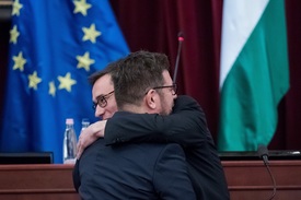 Karácsony Gergely főpolgármester megöleli Kerpel-Fronius Gábort, az átláthatóságért, a részvételiségért, az innovációért és a fenntartható fejlődésért felelős főpolgármester-helyettest (háttal) az új összetételű Fővárosi Közgyűlés alakuló ülésén a Városháza dísztermében 2019. november 5-én.
